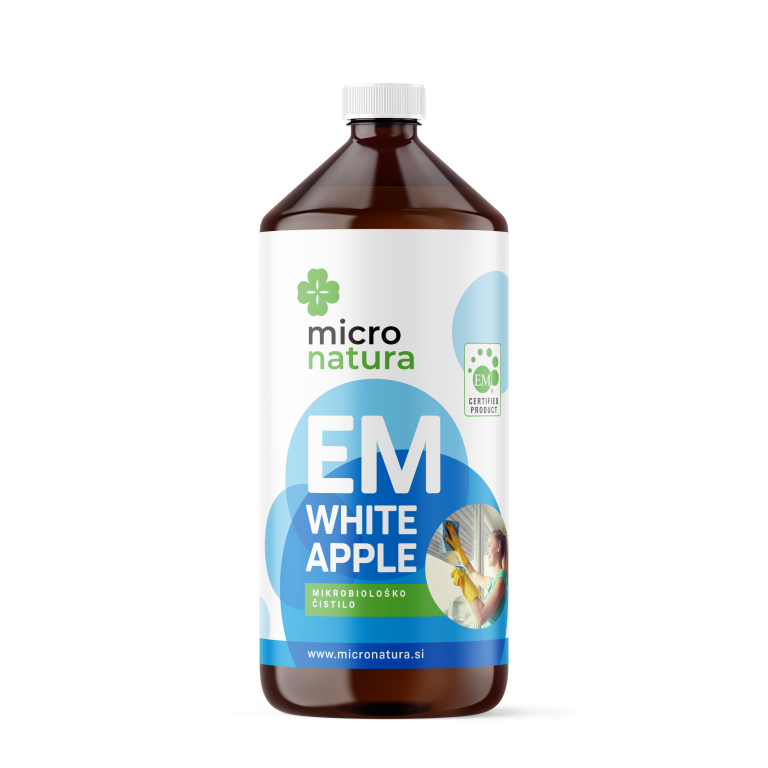 Ob nanosu proizvoda EM® White Apple na površine, ta zaradi dominantnosti izpodrine ostale (škodljive) mikroorganizme in poveča količino pozitivnih mikroorganizmov. Tako nas lahko preneha skrbeti za mikroorganizme, ki bi nam lahko škodili in je zato naše bivanje prijetnejše.